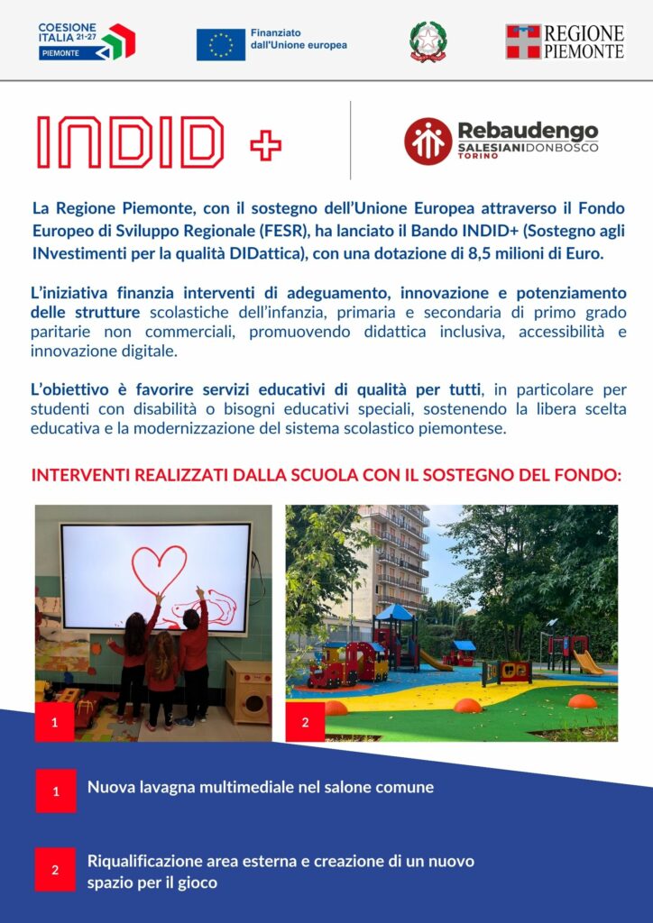 La Regione Piemonte, con il sostegno dell’Unione Europea attraverso il Fondo Europeo di Sviluppo Regionale (FESR), ha lanciato il Bando INDID+ (Sostegno agli INvestimenti per la qualità DIDattica), con una dotazione di 8,5 milioni di euro.